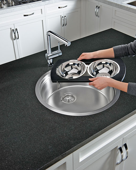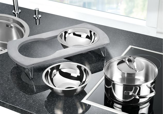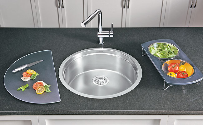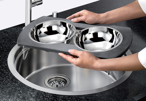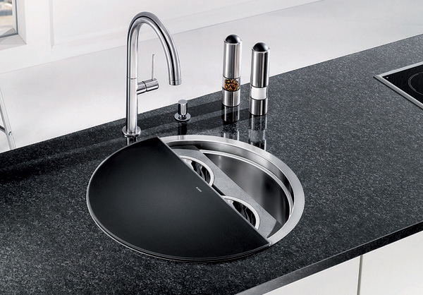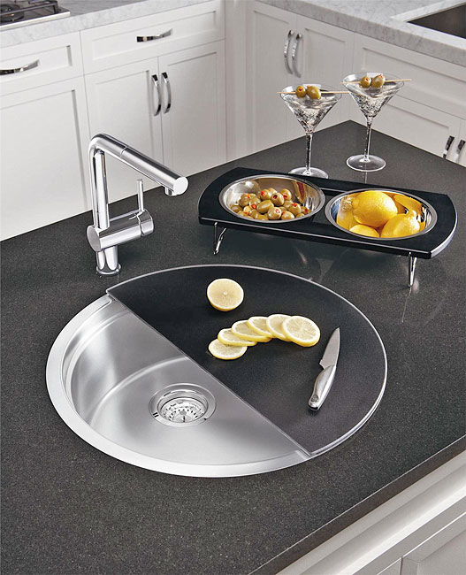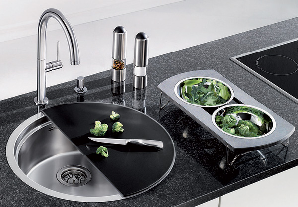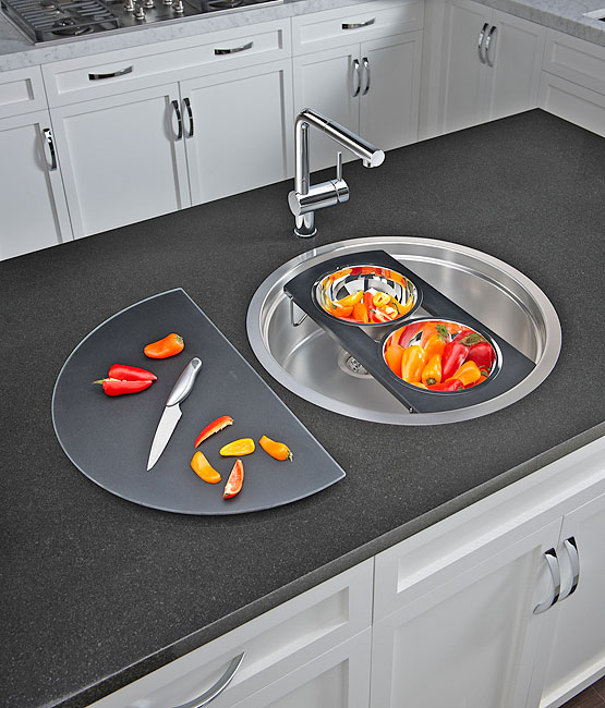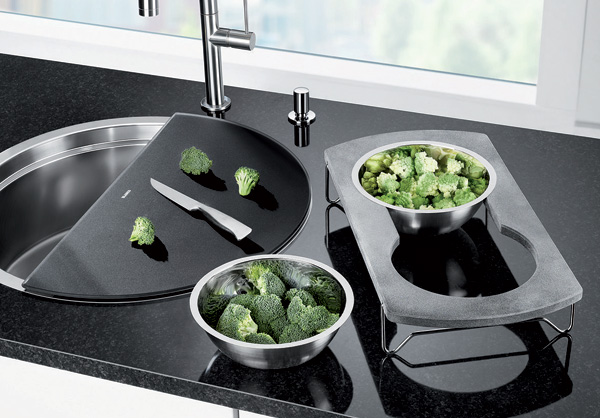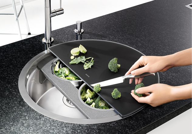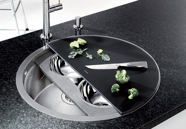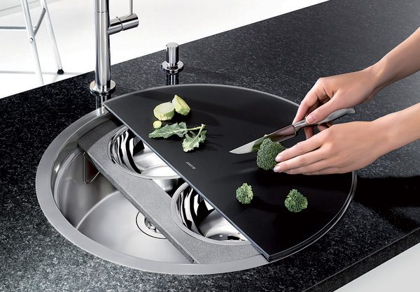 Însă ceea ce o scoate în evidenţă şi o transformă într-o bijuterie multifuncţională sunt accesoriile din dotare şi modul în care acestea se îmbină într-un întreg modular. Un suport cu două vase de inox sub un tocător semirotund de sticlă neagră, ambele putându-se roti liber, cu 360, independent una de cealaltă, în funcţie de nevoi. Asta permite sortarea alimentelor în timpul tăierii, scurgerea eventualelor lichide direct în chiuvetă şi o mulţime de alte operaţii aparent minore dar care fac viaţa mult mai plăcută în probabil cel mai folosit colţ al bucătăriei. Dar să lăsăm imaginile să vorbească:
