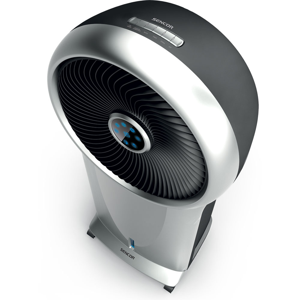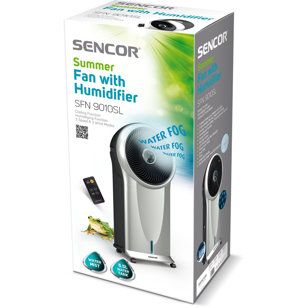 Sencor SFN 9010SL dispune de un rezervor de apă cu capacitatea de 5,5 litri şi o pompă de apă proprie. Pompa se opreşte automat la golirea apei din rezervor. Ventilatorul are 3 viteze de funcţionare (joasă, medie şi mare) şi mai multe moduri de operare: